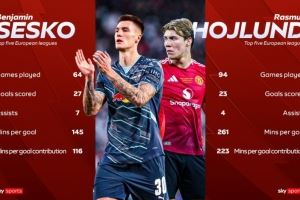 体育资讯8月9日讯 曼联今天官宣签下塞斯科,天空体育随后对比了他与霍伊伦在五大联赛的数据。